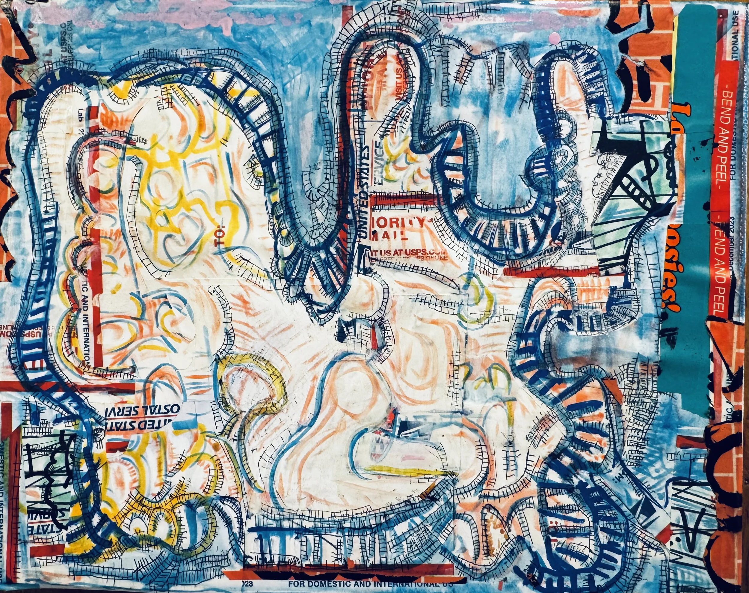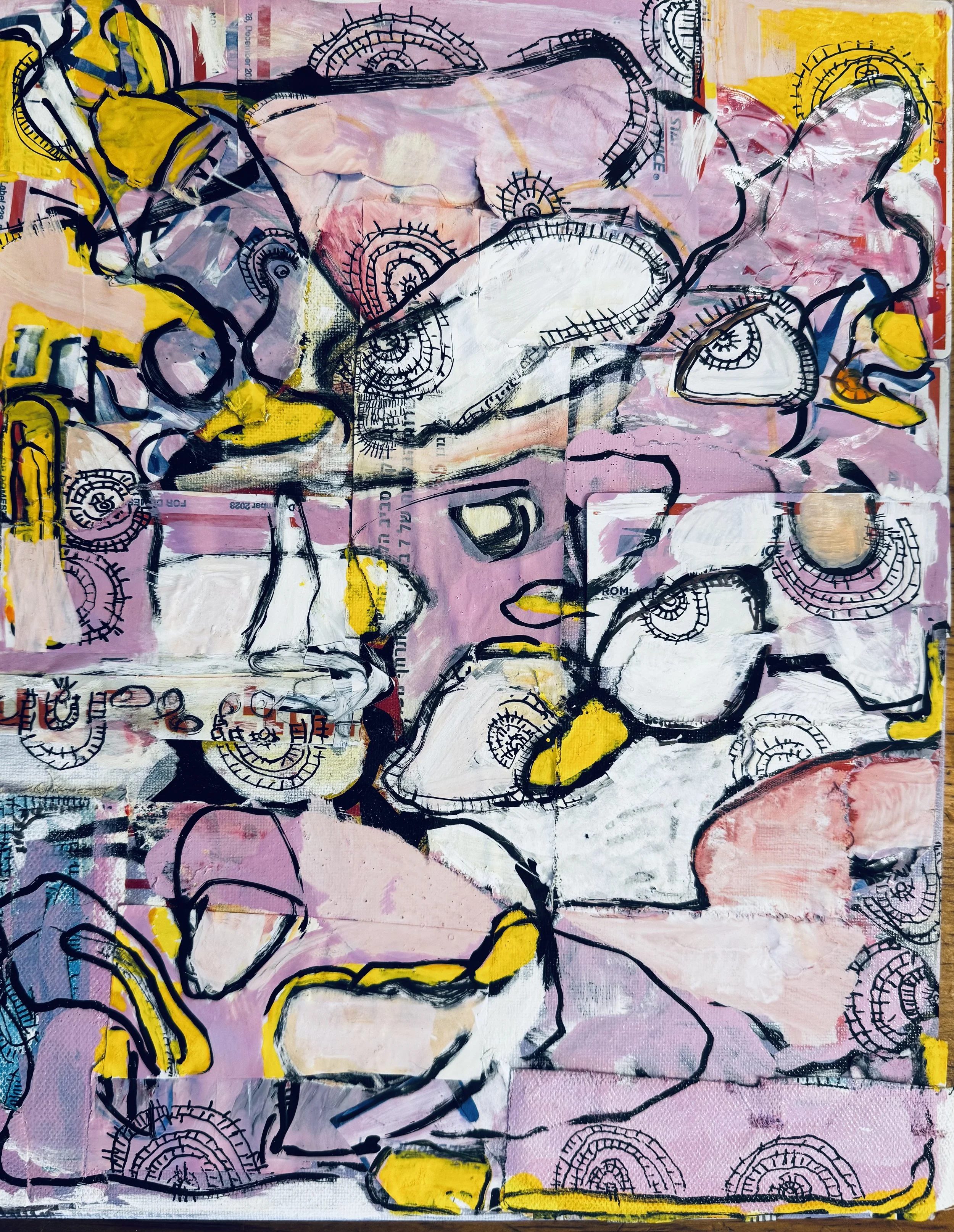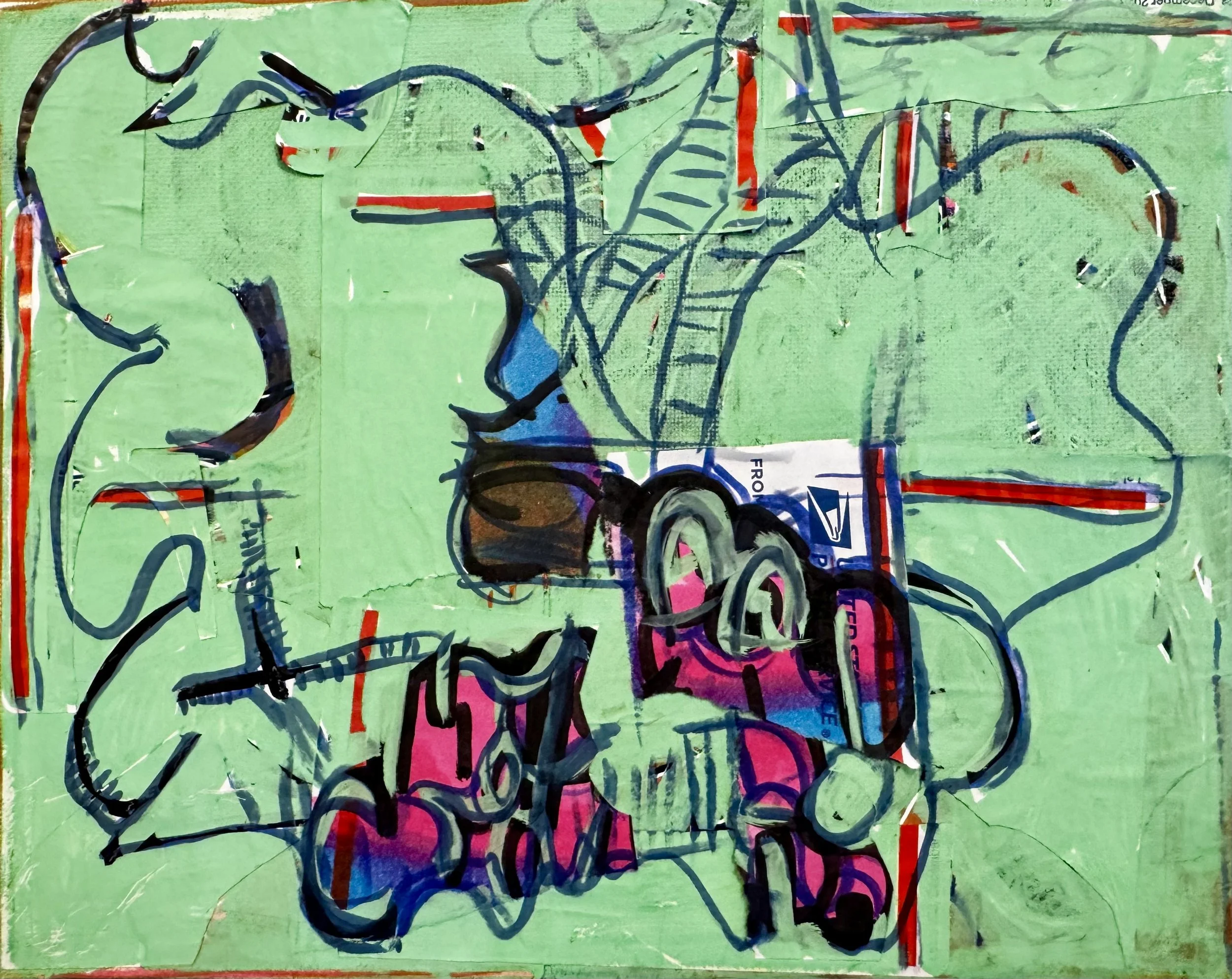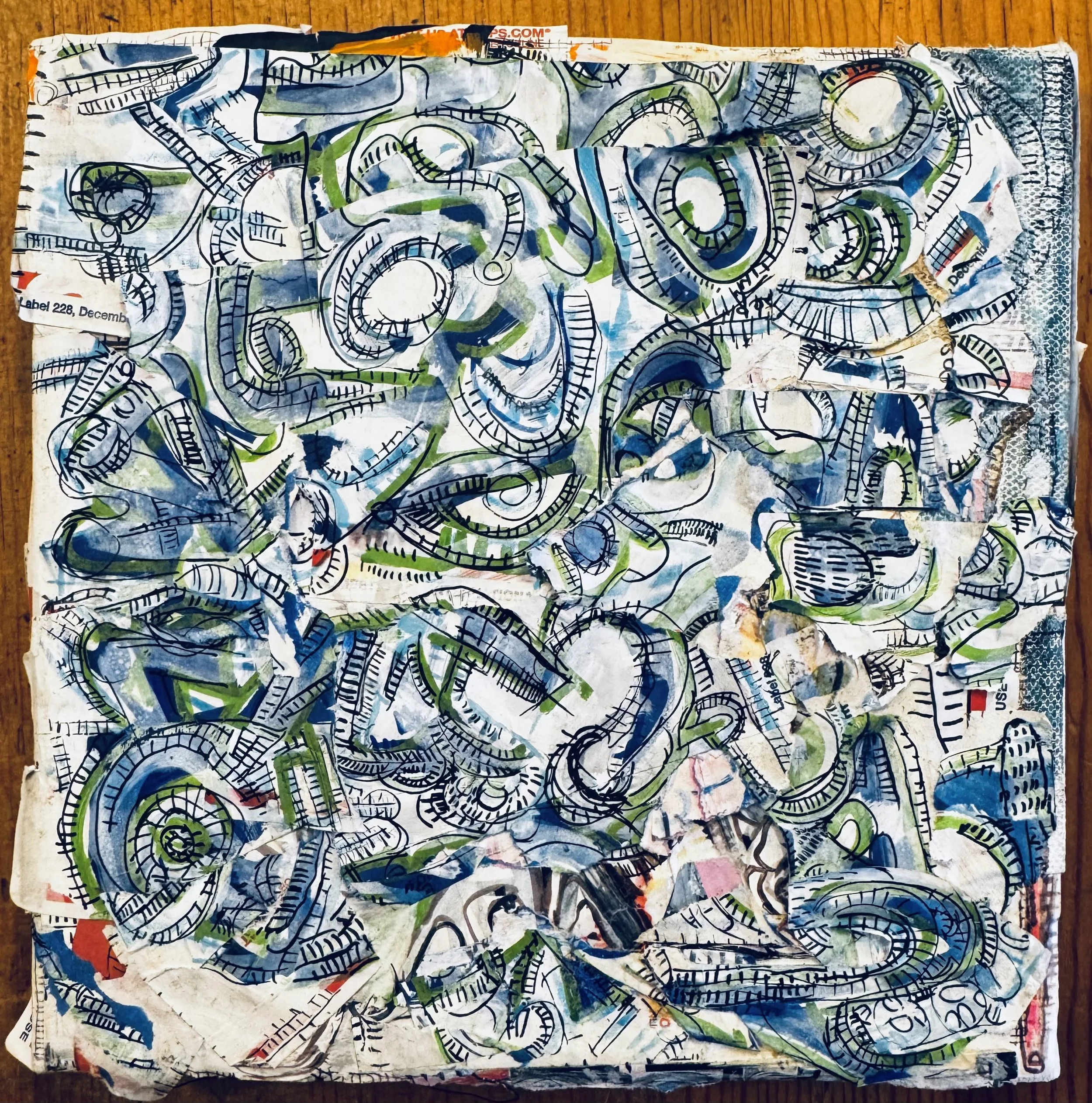 I created a series of collages repurposing my youngest son’s discarded graffiti stickers. In these works I found myself constructing liminal spaces with ladders going in many different directions. At first they were just going up, as if to the heavens, mimicking Jacob’s ladder. As I progressed these ladders started to go in different directions. It made me think of my role as a Jewish Mother post October 7th, trying to find my place in this new world.