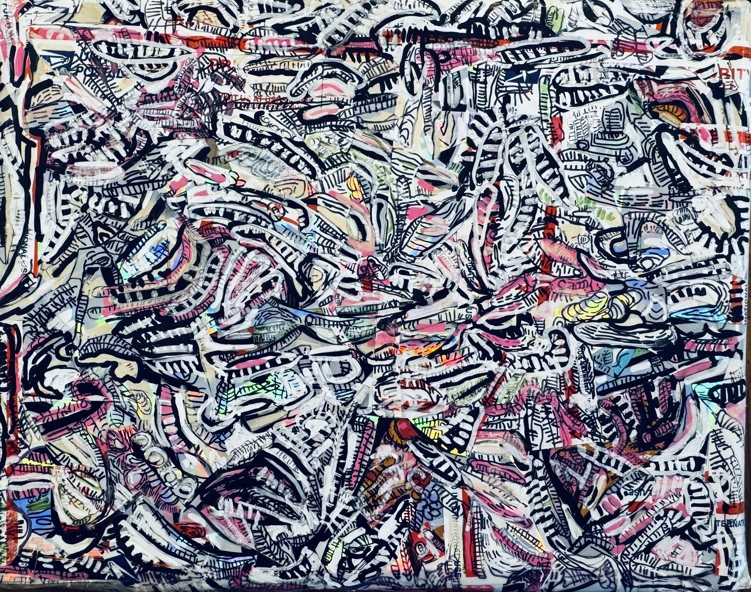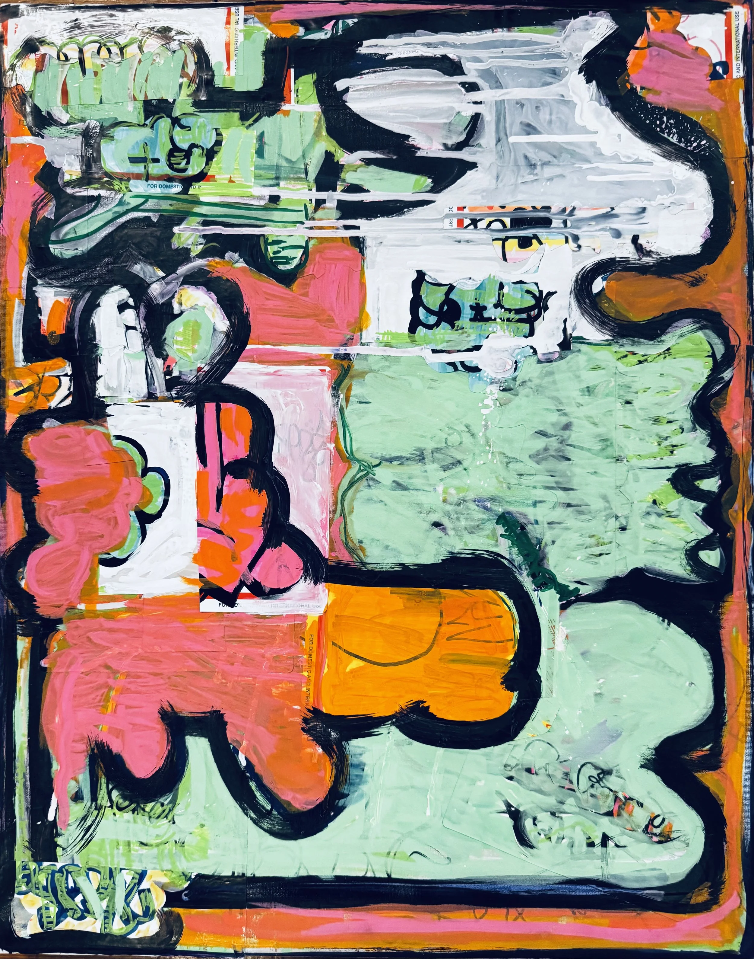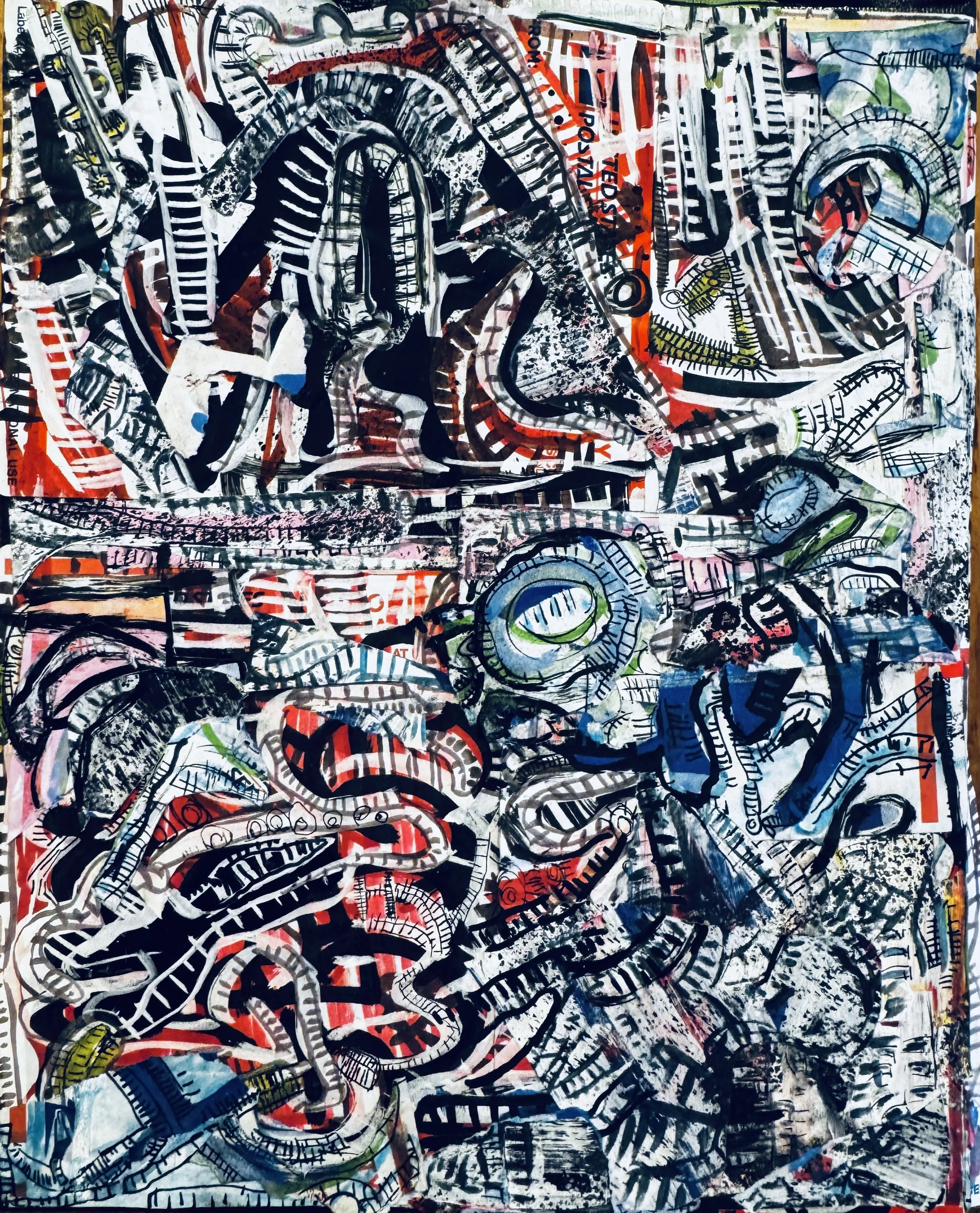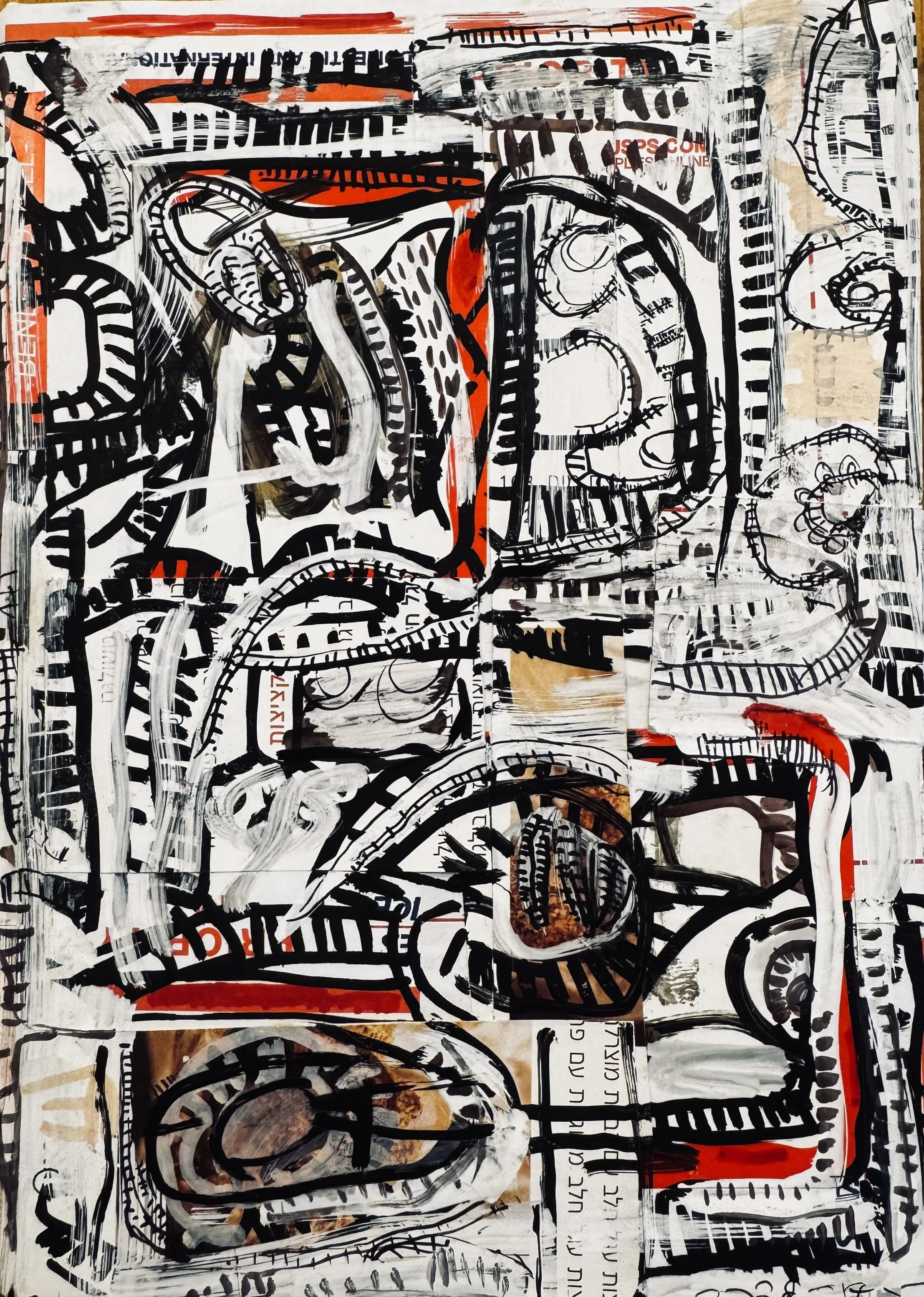 I created a series of collages repurposing my youngest son’s discarded graffiti stickers. In these works I found myself constructing liminal spaces with ladders going in many different directions. At first they were just going up, as if to the heavens, mimicking Jacob’s ladder. As I progressed these ladders started to go in different directions. It made me think of my role as a Jewish Mother post October 7th, trying to find my place in this new world.